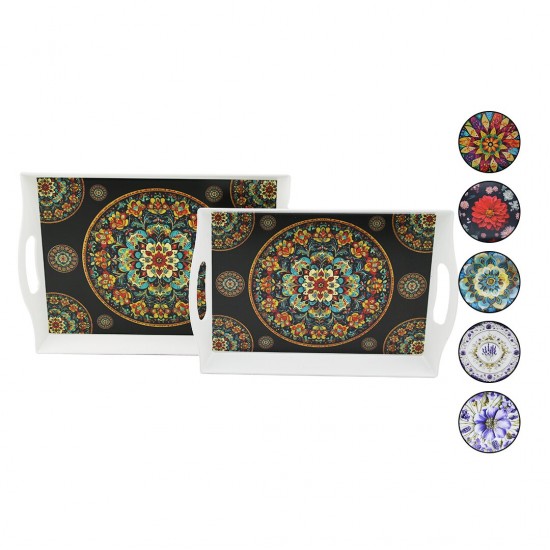 MENNUR HOME MNR-139 ( 2Lİ SET & DİKDÖRTGEN ) LOTUS TEPSİ (KULPLU RENKLİ DESENLİ) (22.2X30.4CM & 25.5X33.8CM)*12=K