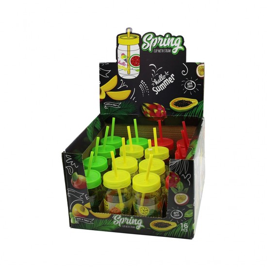 QLUX C-00162 SPRİNG ( PİPETLİ ) ( CAM = MEYVE DESENLİ ) KAVANOZ BARDAK ( 380CC ) ( RENKLİ PLASTİK KAPAK & PİPET )*16X2